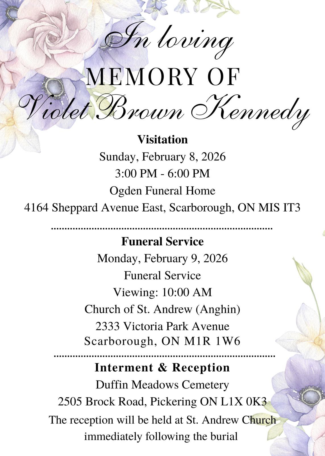 A tribute wall and more may be found on the Ogden Funeral Home website: https://ogden.funeraltechweb.com/tribute/details/21732/Mrs-Violet-Kennedy/service-information.html#content-start. A flyer shared by the family is attached to this email.